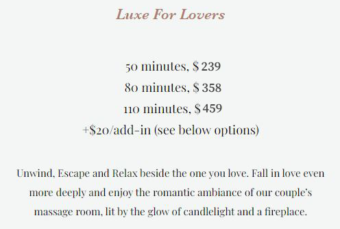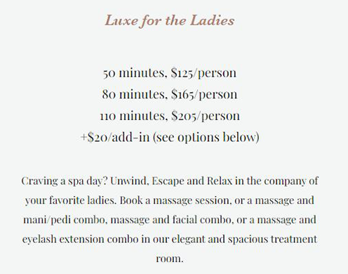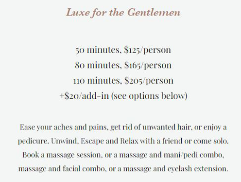 Pricing Included with every massage Organic massage oil Aromatherapy Choice of massage modality (determined by provider) Selection of beverage Luxurious Linens Add Ons - $20/each